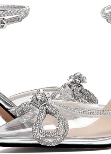 Women’s Lace up High Heeled Sandals Ankle Buckle Strap Rhinestone Bowknot Stilettos Satin Pointy Pumps Transparent PVC