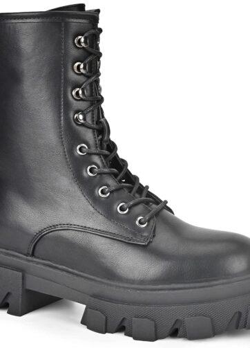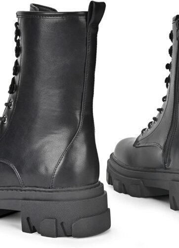 Women’s Low Heeled Fashion Platform Ankle Biker Booties Causal Chunky Lace Up Combat Boots Black Calfskin